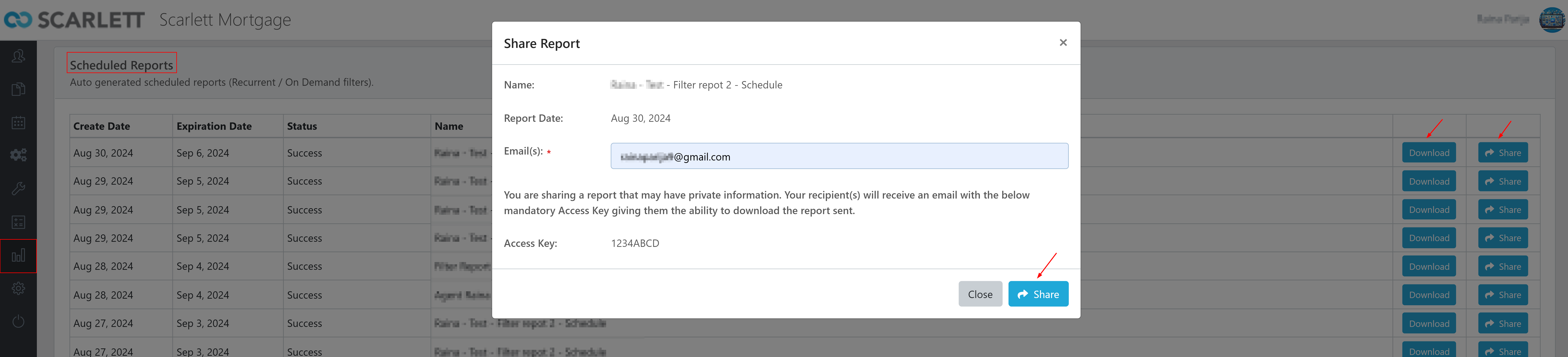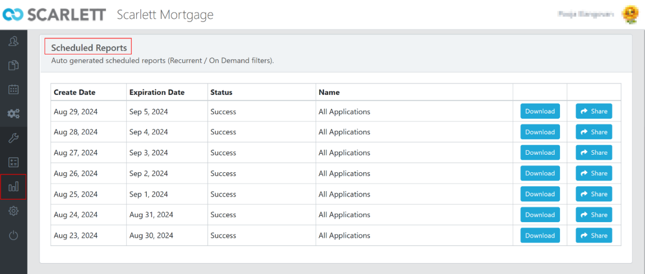 Users can access them from the Scarlett side menu under “Reports” and can choose to share or download these reports.