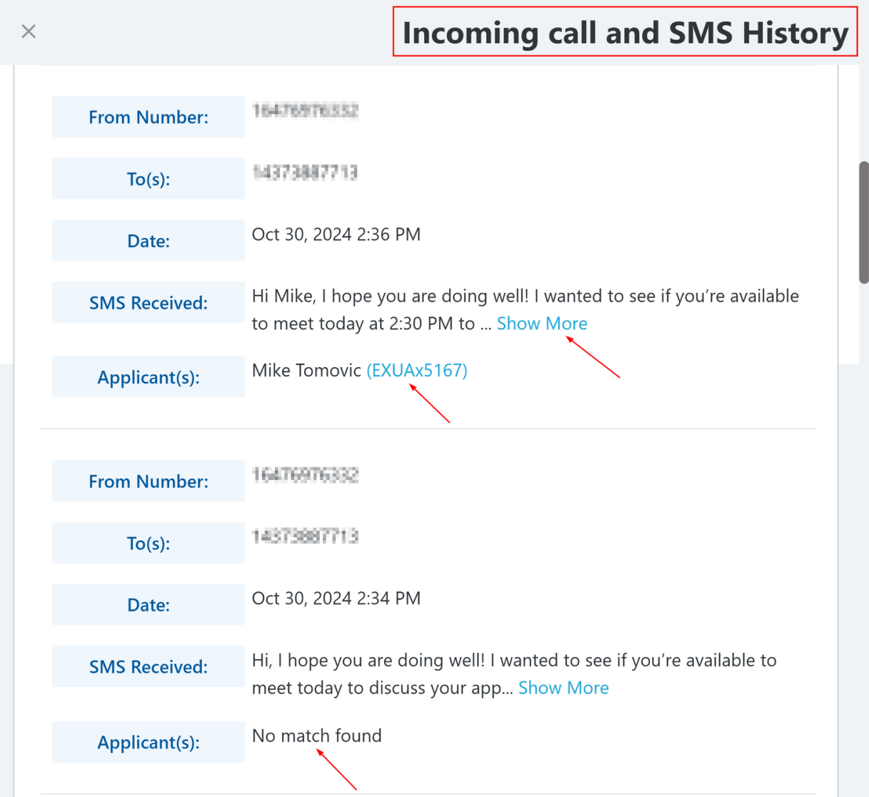 All SMS logs are captured in the “Incoming Call and SMS History” section of the SMS History tab. This includes SMS logs that are not linked to a specific lead or deal.