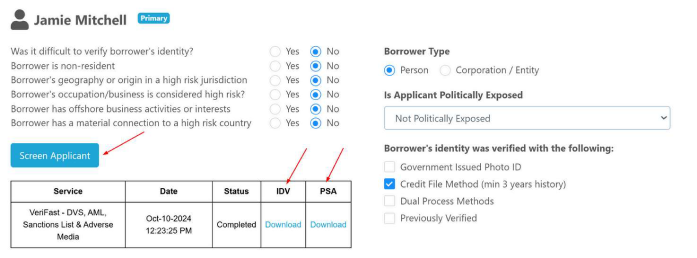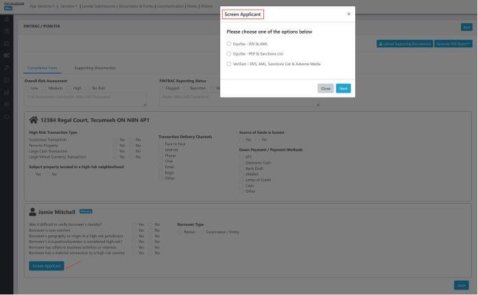 FINTRAC now includes a “Screen Applicant” Option. This provides the User with the ability to select from three available options to aid in screening their applicant(s).