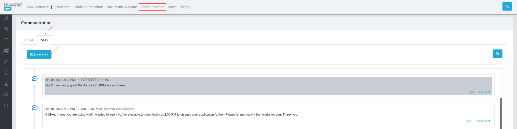 Agents who have set up their Twilio accounts, can view incoming and outgoing SMS messages relating to their applicants on the communication page for specific leads or deals.